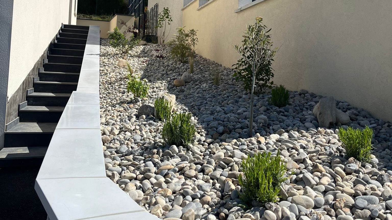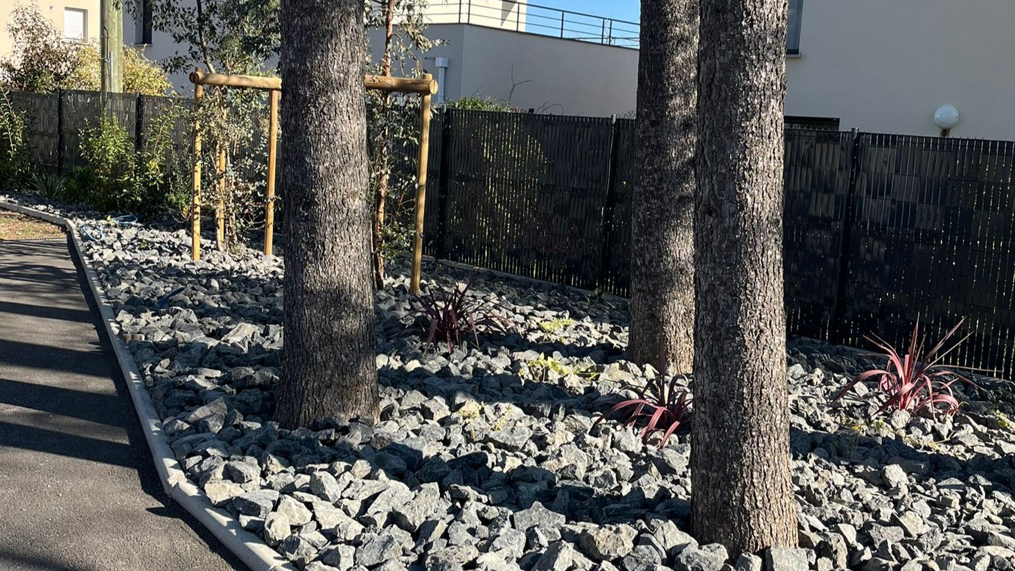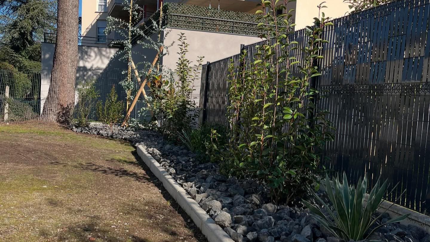 Création de massifs harmonieux, pose de galets décoratifs et structuration naturelle des espaces verts.