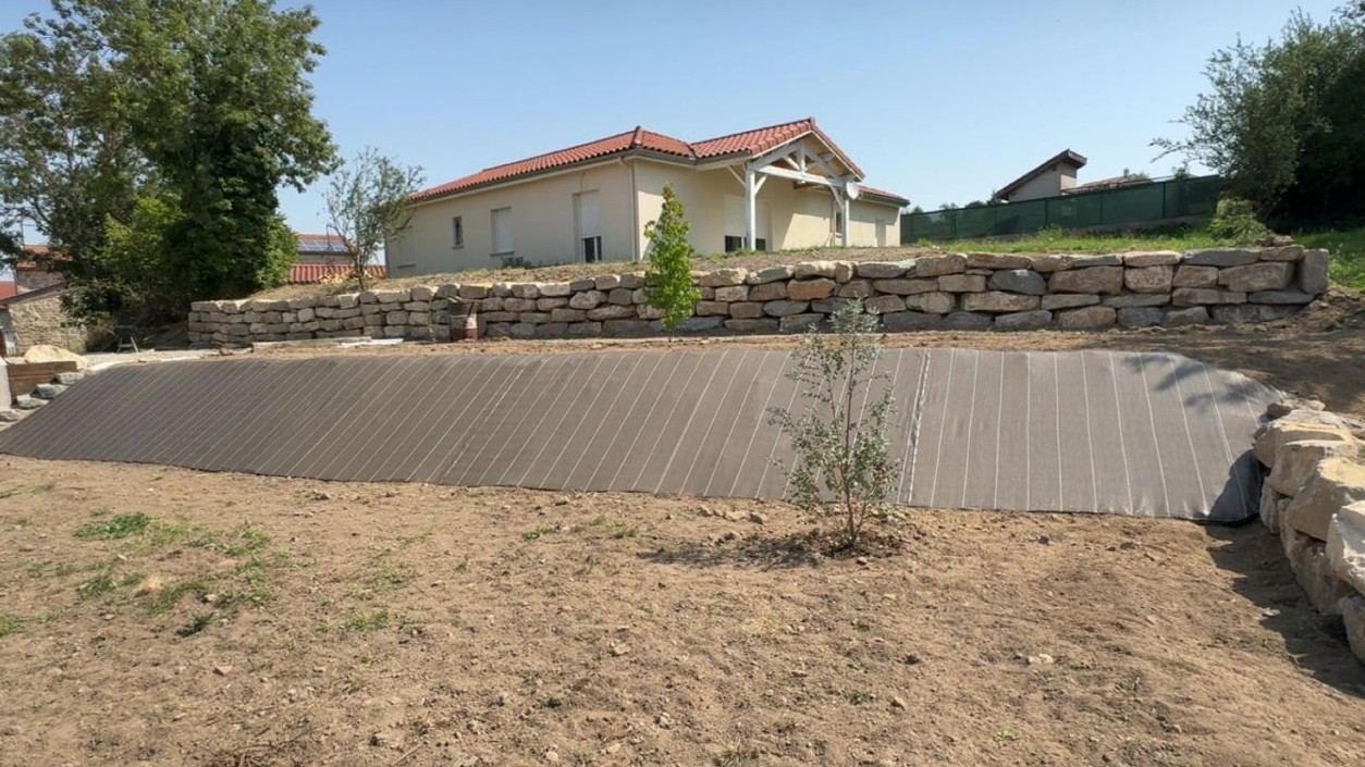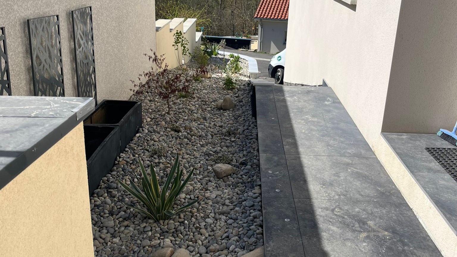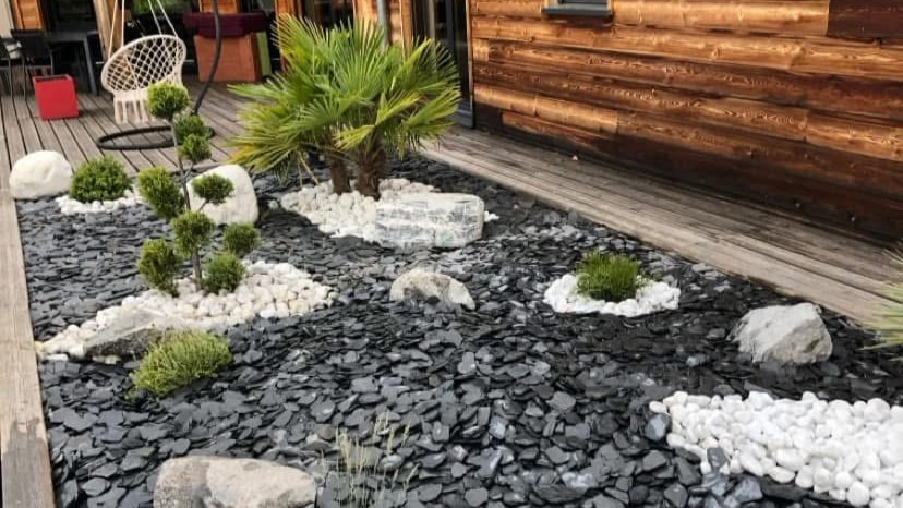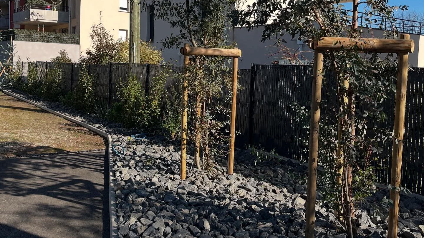 Création de massifs harmonieux, pose de galets décoratifs et structuration naturelle des espaces verts.